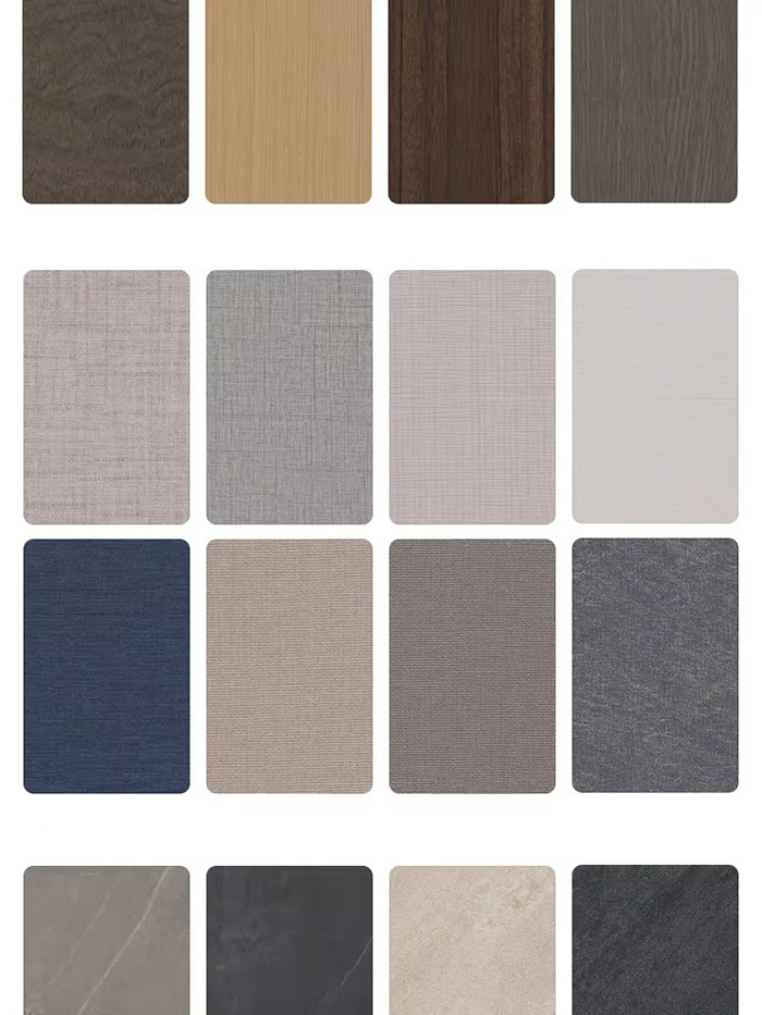 Utilizați tehnologia de adeziv PUR cu topitură la cald pentru a acoperi masca cu diferite culori, cum ar fi granulație lemnoasă, granulație pânză, culoare solidă, granulație de piatră etc.