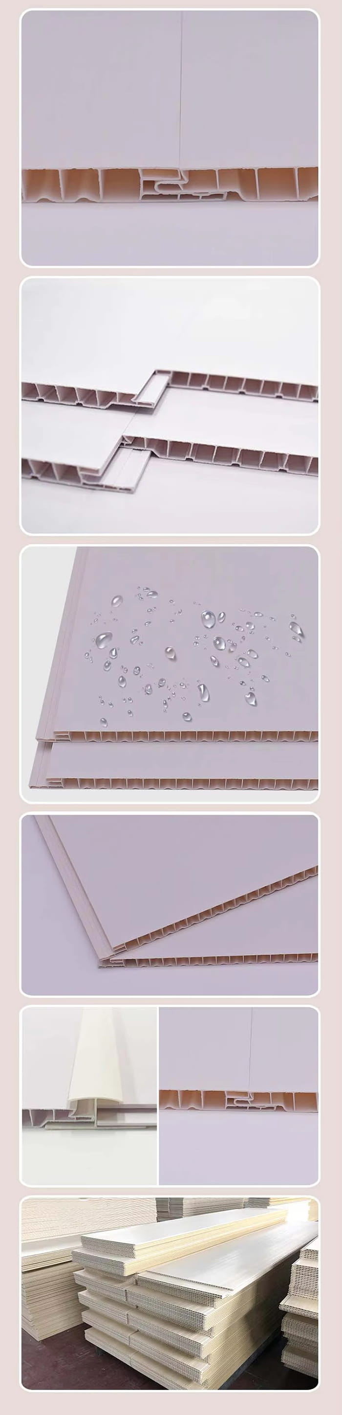 Plafonul din PVC este un material decorativ realizat din rășină de clorură de polivinil (PVC) ca materie primă principală, se adaugă pulbere de carbonat de calciu și stabilizator și este combinat printr-un proces de temperatură ridicată și presiune înaltă. Suprafața adoptă tehnologia de imprimare, transfer sau laminare, care poate simula diverse texturi, cum ar fi granulația lemnului și granulația de piatră, și are caracteristicile impermeabile și rezistente la umiditate, ignifuge, greutate ușoară și rezistență ridicată. Este potrivit pentru scenele cu umiditate ridicată sau cerințe decorative ridicate, cum ar fi bucătării, băi, spitale și spații comerciale și este un înlocuitor ideal pentru plăcile de gips-carton tradiționale și gurile de aluminiu.