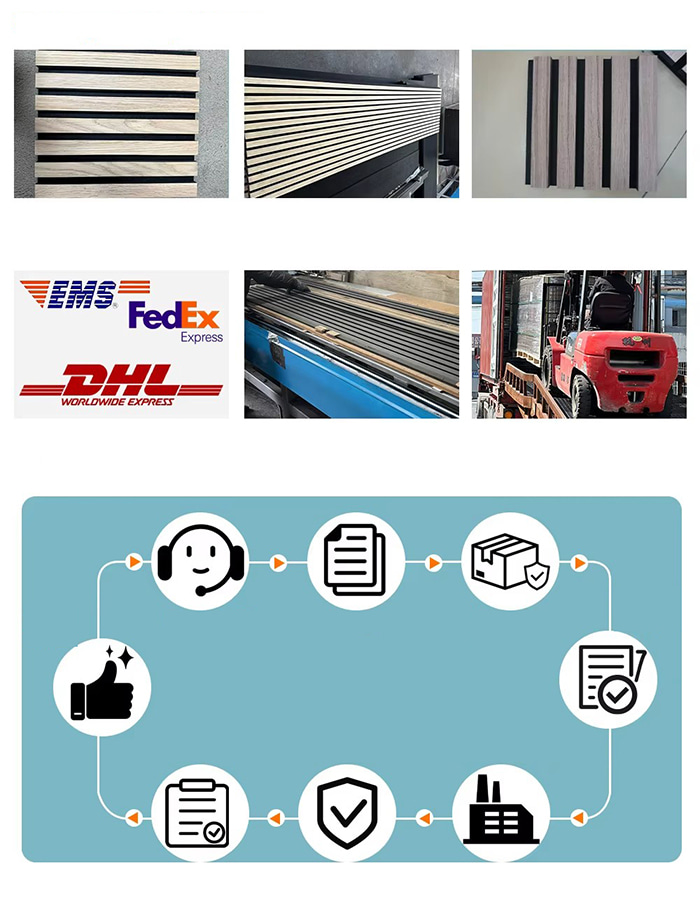 Inspecție de calitate: În timpul procesului de producție, panourile fonoabsorbante WPC sunt inspectate strict de calitate, inclusiv acuratețea dimensională, planeitatea, densitatea, rezistența la foc, performanța de protecție a mediului și alte aspecte.